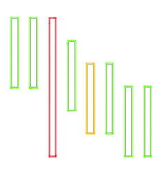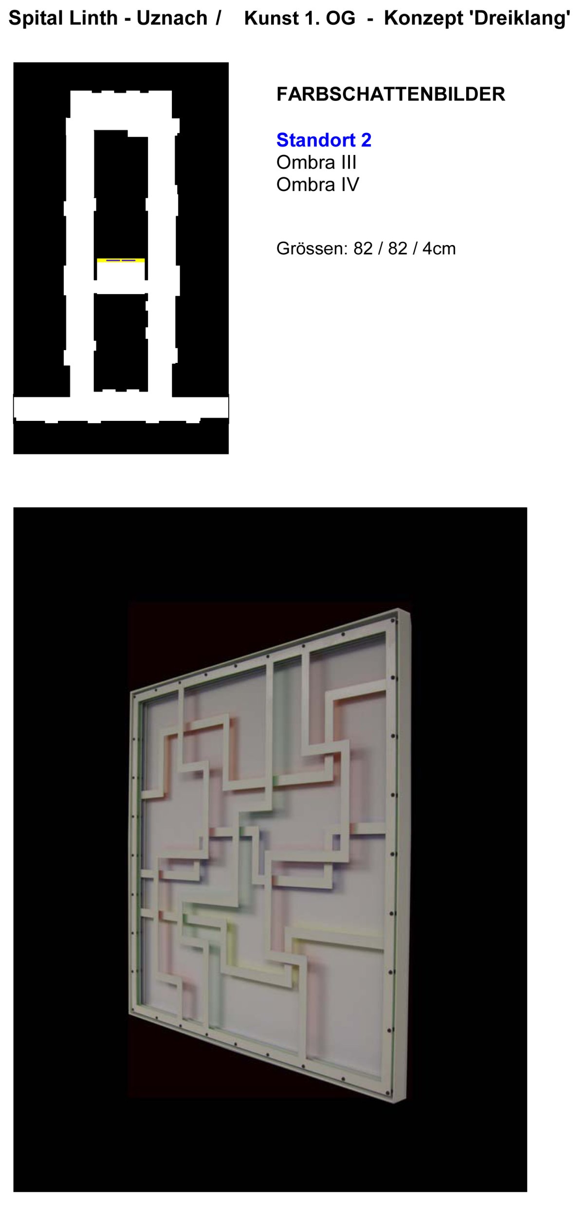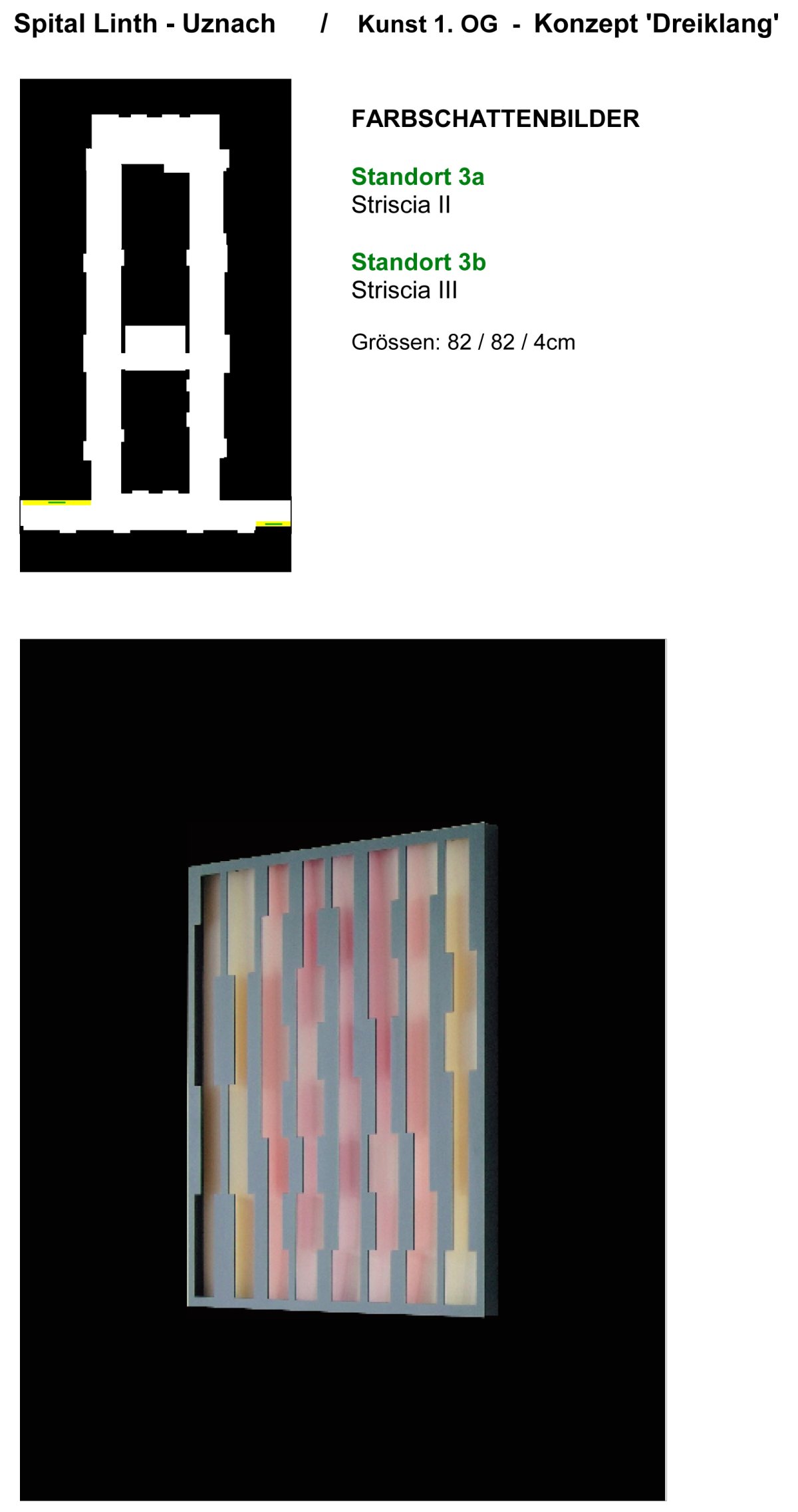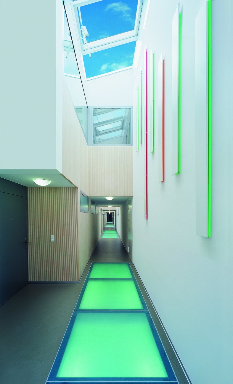 Vertikale, 1.80 & 3.60 m hohe, auf der Vorderseite weiss lackierte MDF-Paneele mit einer Breite 15 cm sind auf deren Rückseite mit den Farben rot, blau, gelb, violett, grün und orange bemalt und 3 cm von der Wand losgelöst montiert. Das zenithale Licht erzeugt dadurch einen natürlichen Farbschatten auf der Wand.
